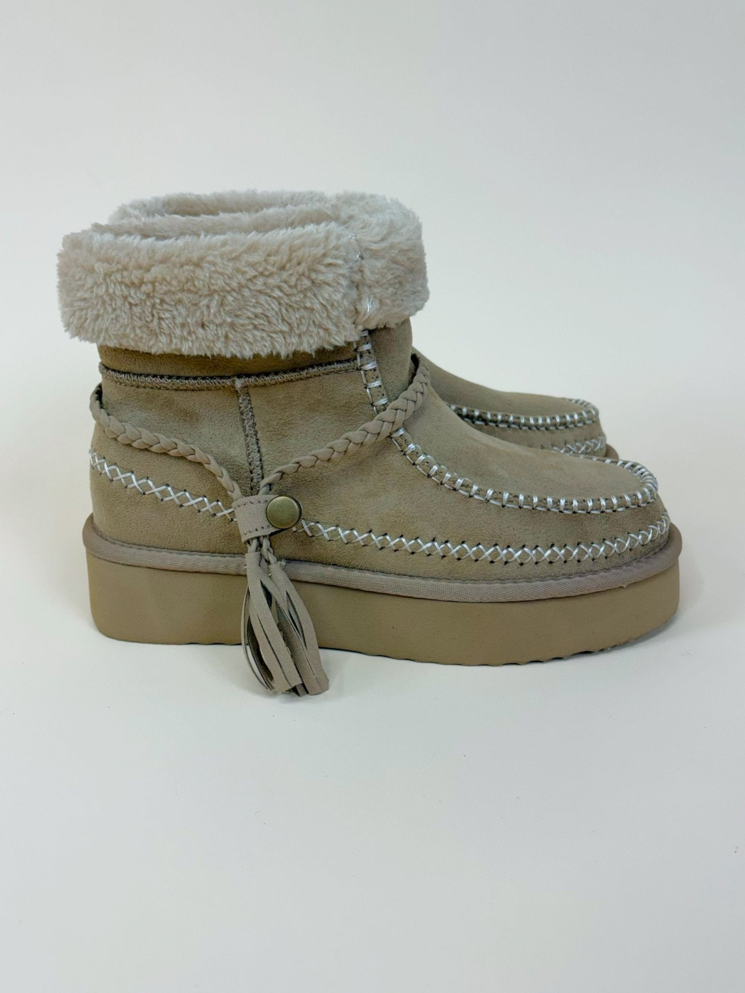 A stylish slip-on bootie featuring a chic platform heel designed for comfortable, everyday wear during the cooler months.