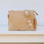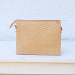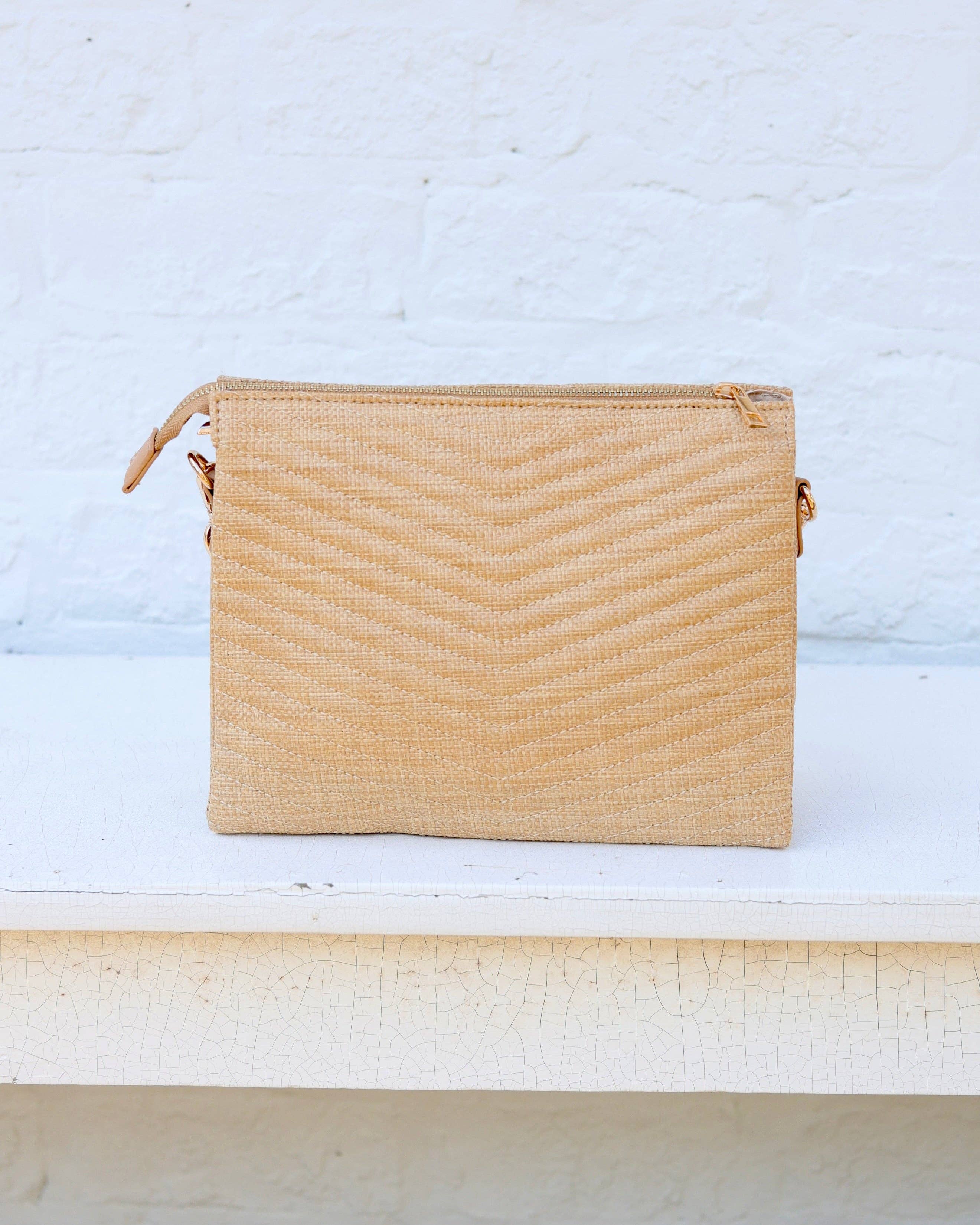 This V quilted straw crossbody is so fashion forward! It has a chunky gold chain accent that is removable, and it can be used as a carrying strap as well. The nylon crossbody strap is super stylish and is also adjustable and removable. The top zipper closure leads to two open compartments as well as a third middle zippered section. It also has two smaller internal open pockets and one zippered pocket.