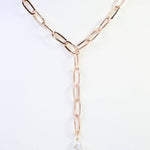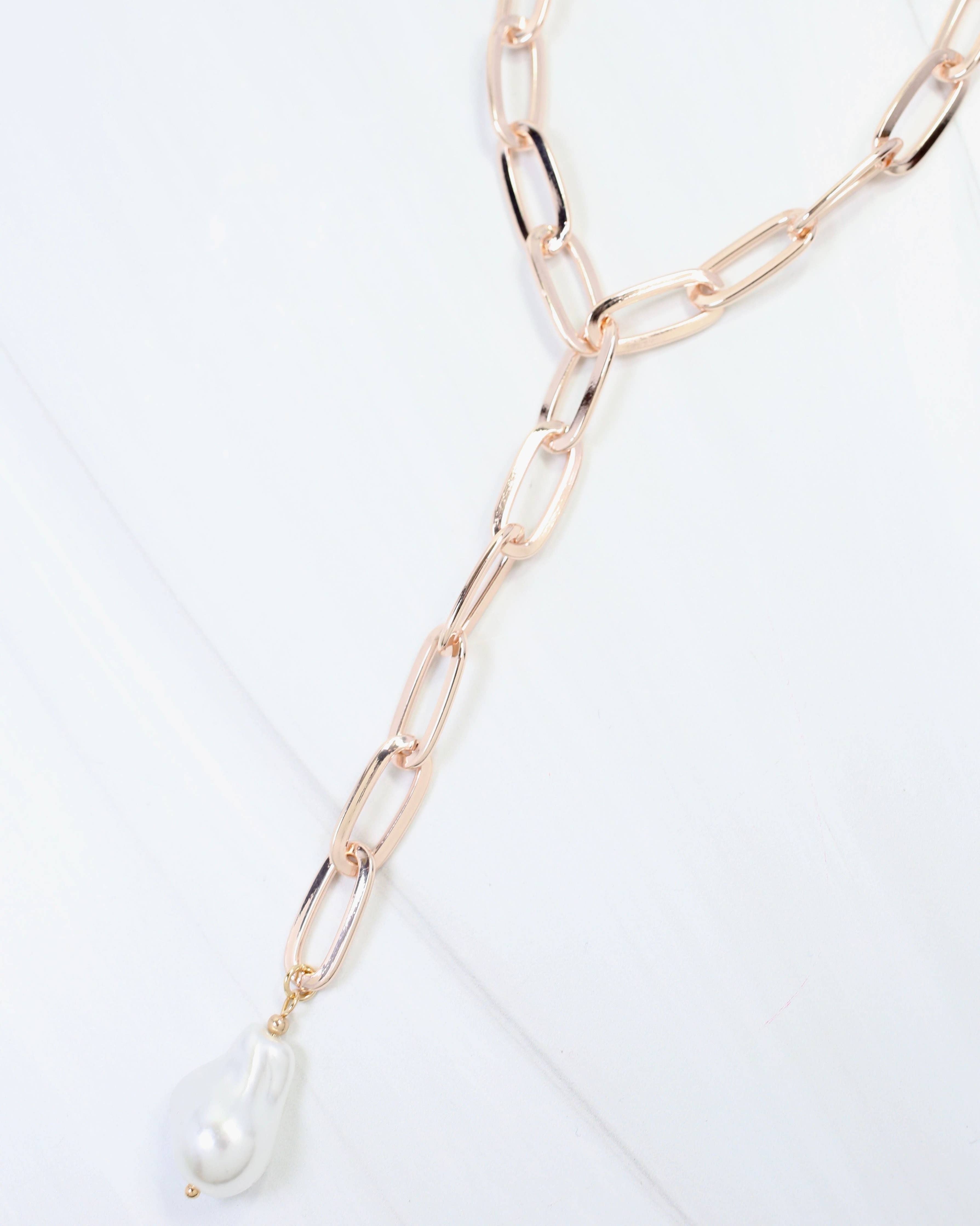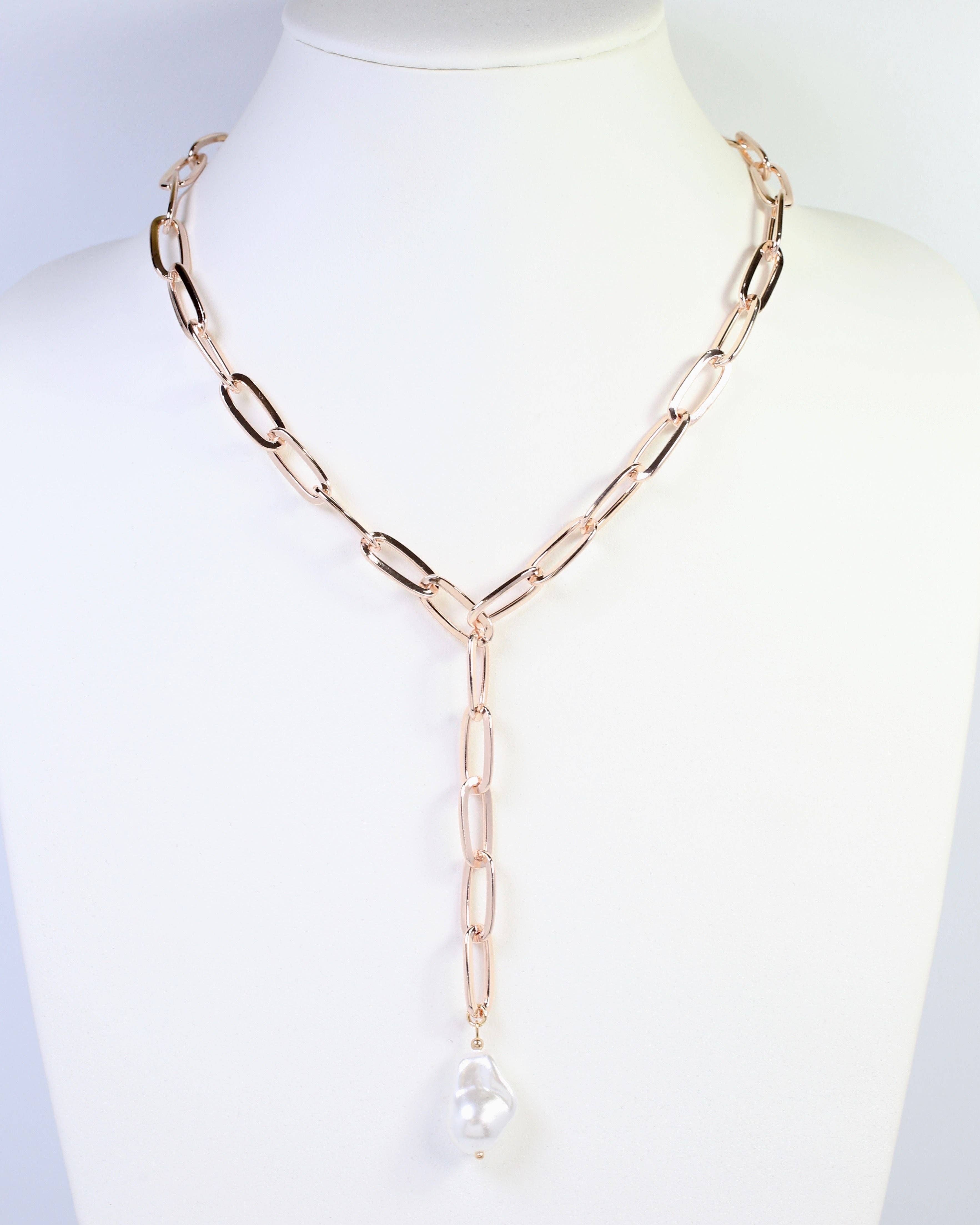 Embrace organic elegance with the Olean Baroque Pearl Link Y Necklace in gold (has a hint of a Rose Gold look). Featuring lustrous baroque pearls suspended in a graceful Y silhouette, this piece brings natural beauty and refined sophistication to your collection. A versatile statement necklace for any occasion.