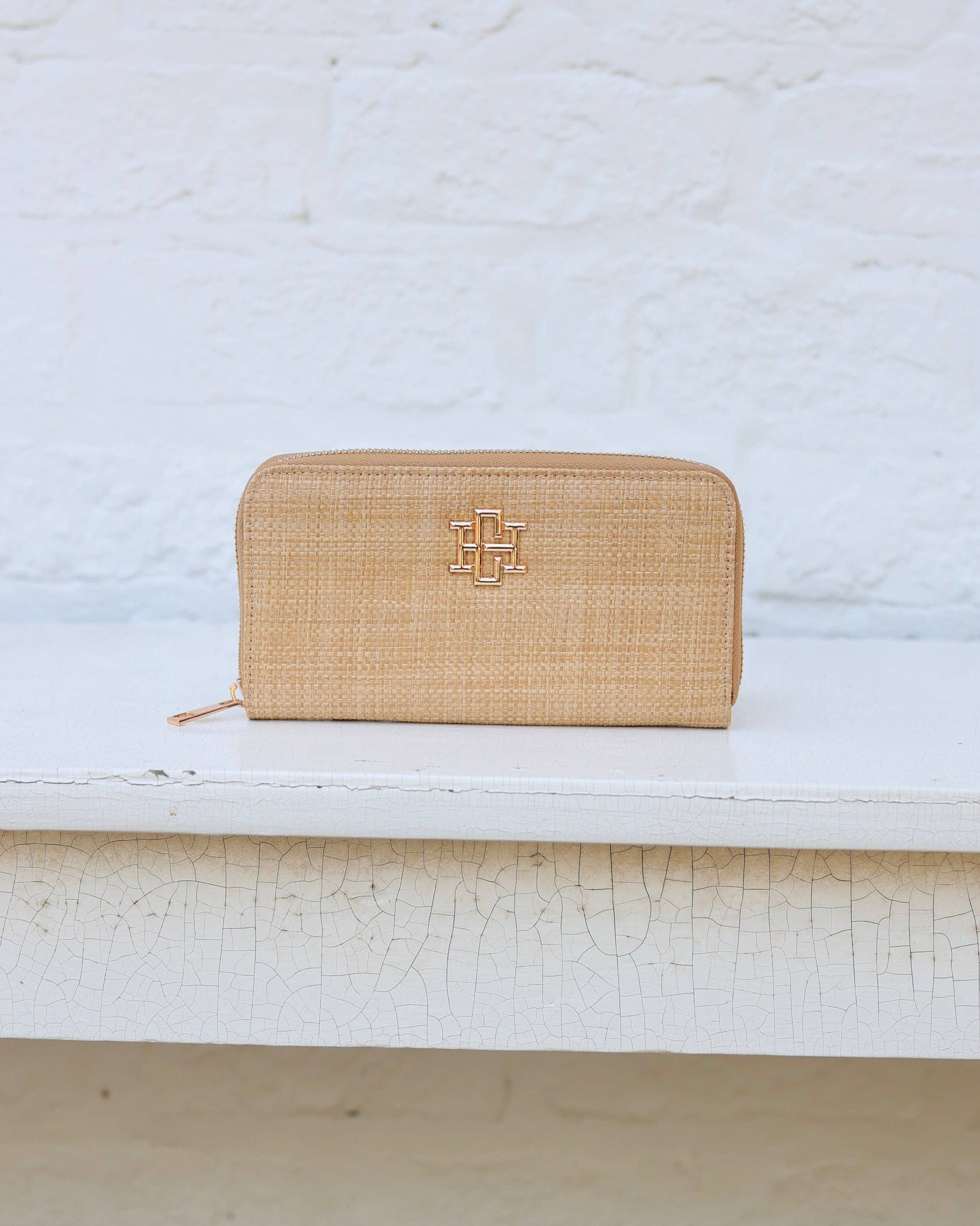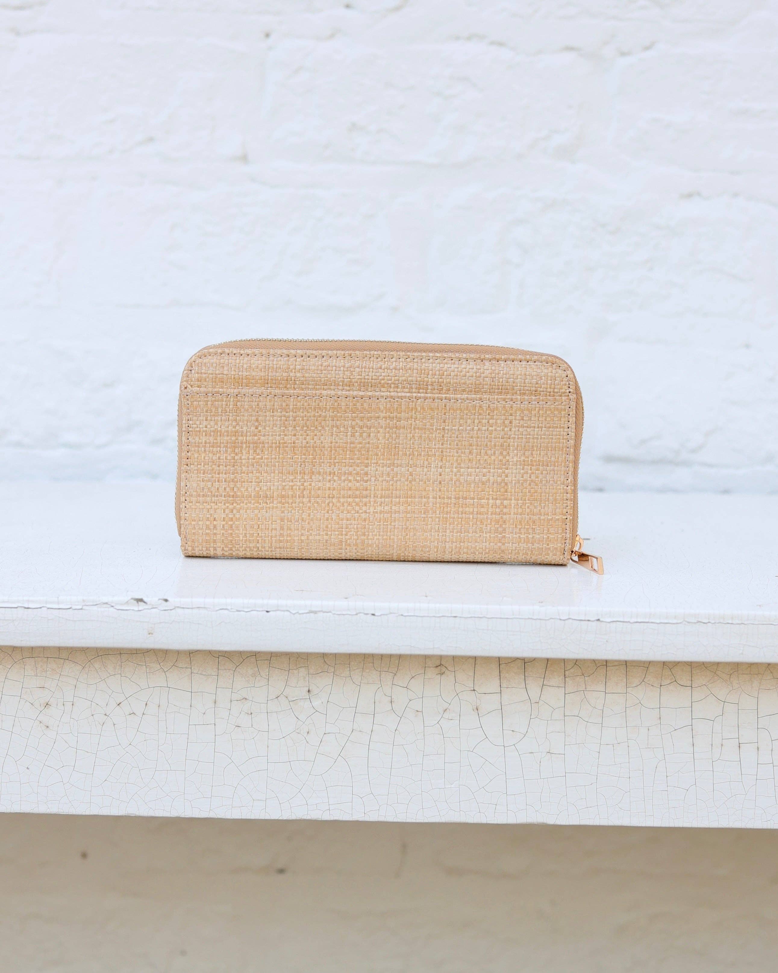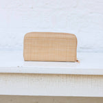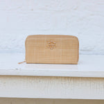 The Penelope Wallet in Natural straw features an elongated zip design with a central zippered coin pouch and two sets of card holders for organized storage. An outside slit pocket offers quick-access space, making it a stylish and practical accessory that holds all your daily essentials effortlessly.
