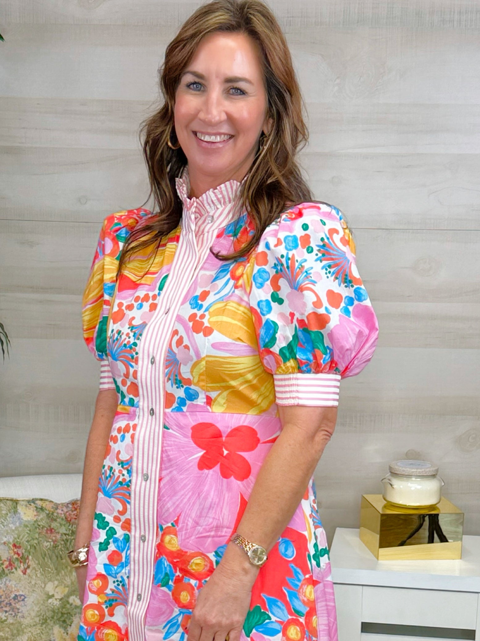 A colorful floral maxi dress featuring puff sleeves, a ruffled neckline, and a full button-front design with eye-catching mixed prints.