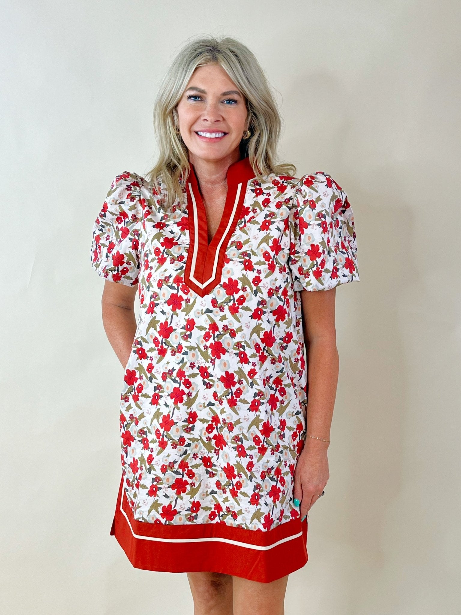 A vibrant floral print mini dress with a warm, autumn-inspired color palette. Featuring puff sleeves, a bold contrast trim neckline, and a coordinating hem border, this dress blends playful charm with a touch of sophistication.