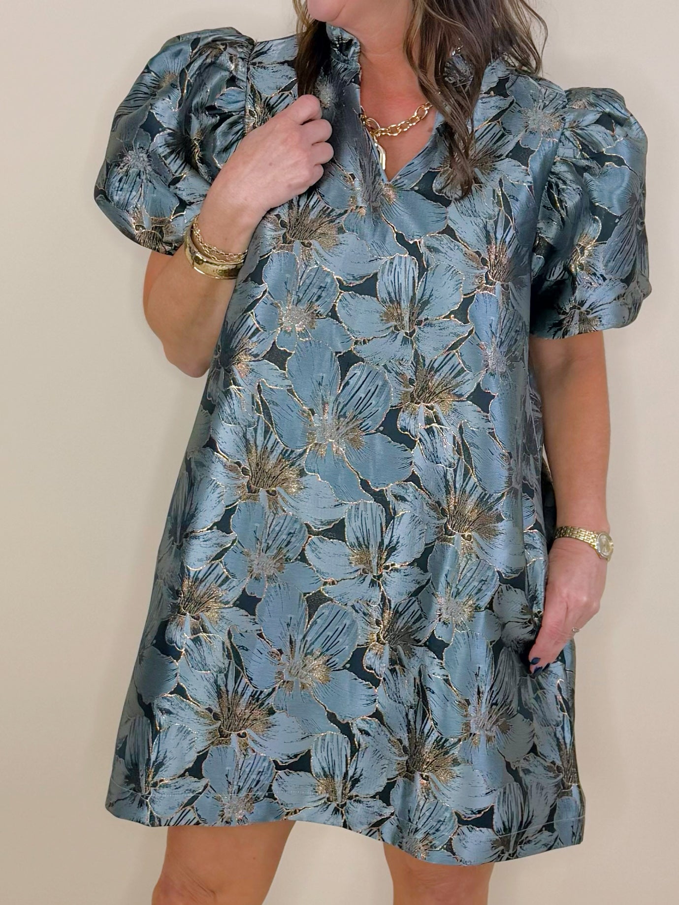 A woven floral shift dress with puff short sleeves, a notched V-neckline, and a relaxed, straight silhouette.