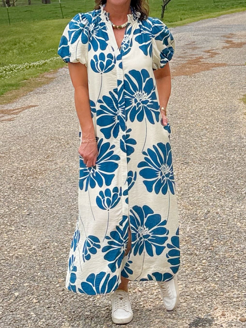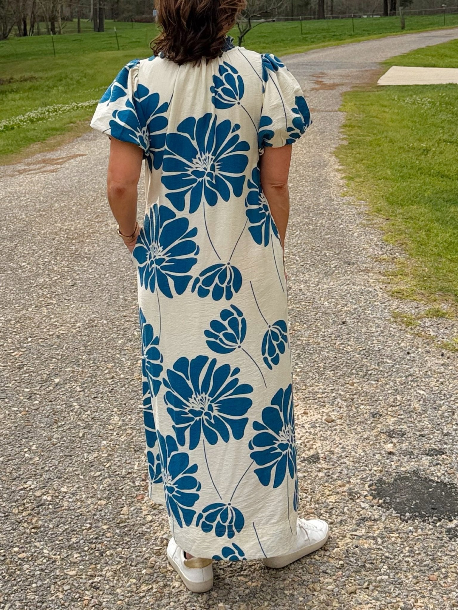 A striking floral midi dress featuring oversized indigo blooms against a soft ivory backdrop. Designed with a flattering V-neckline, button-down front, and a delicate smocked neckline, this lined dress offers an easy, breezy silhouette that feels bold yet beautifully feminine.