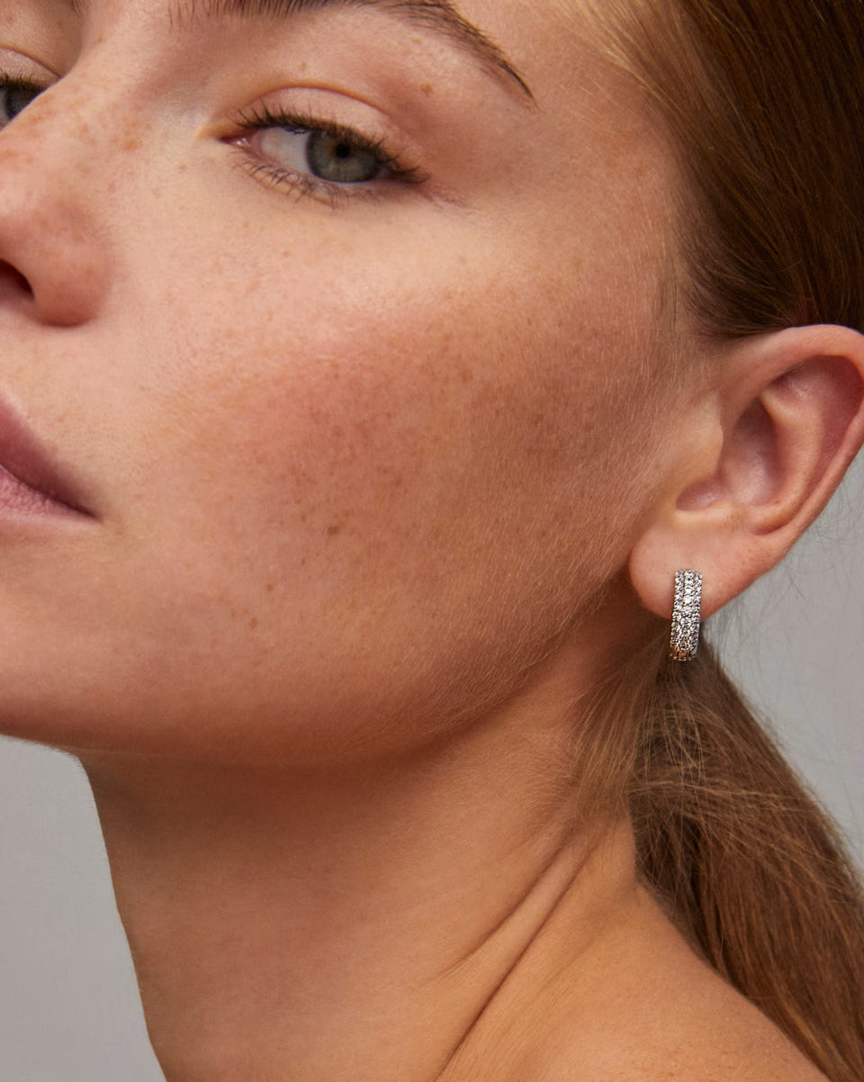 The Mikki Pave Huggie Earrings in Silver take our everyday essential and elevate them with a touch of sparkle. Featuring a row of gleaming pave crystals, these petite earrings are the minimalist statement everyone will love.