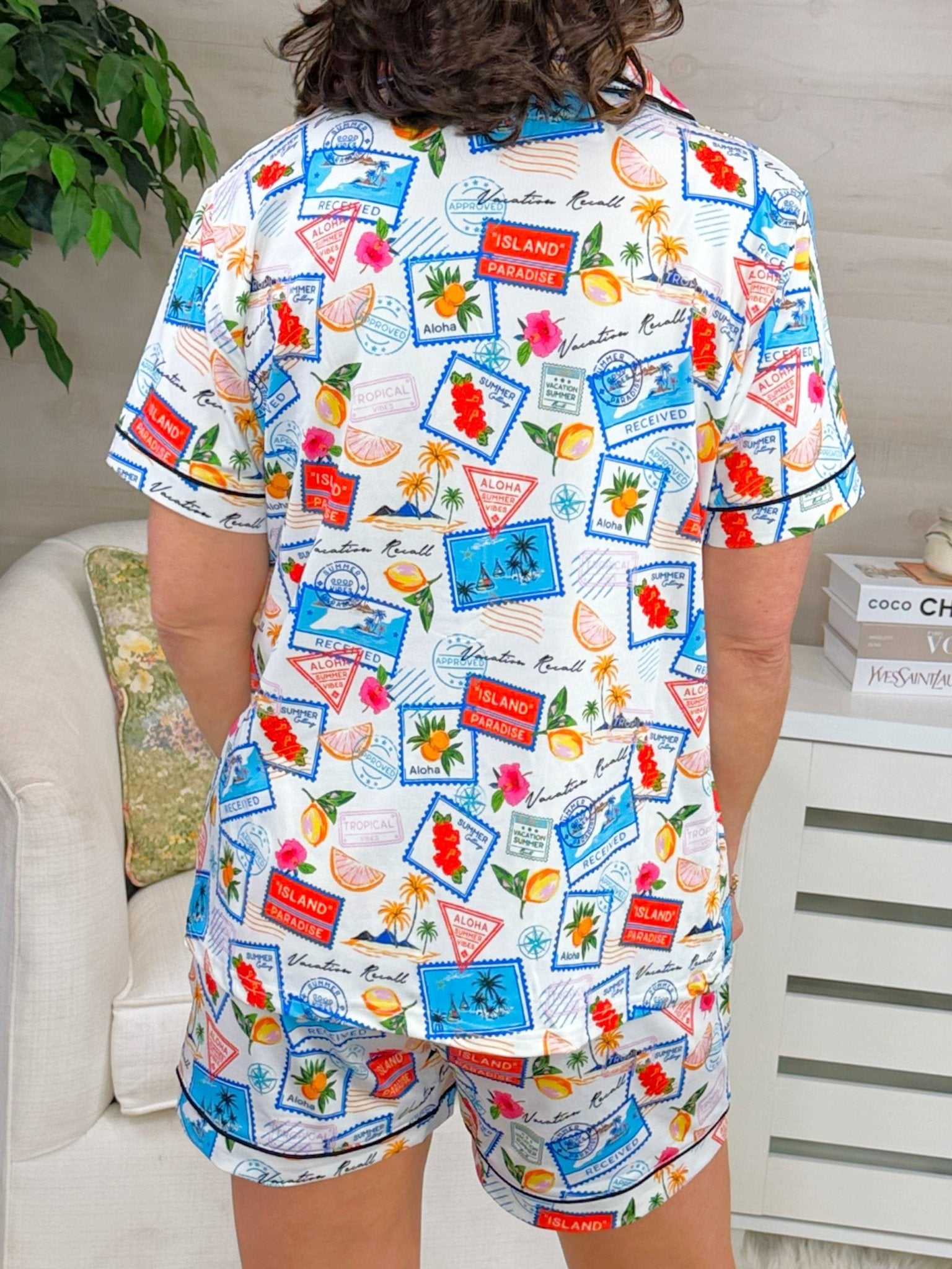 A playful, comfy lounge set featuring a button-front top and matching elastic-waist shorts with a fun vacation-inspired print.