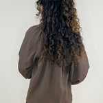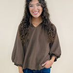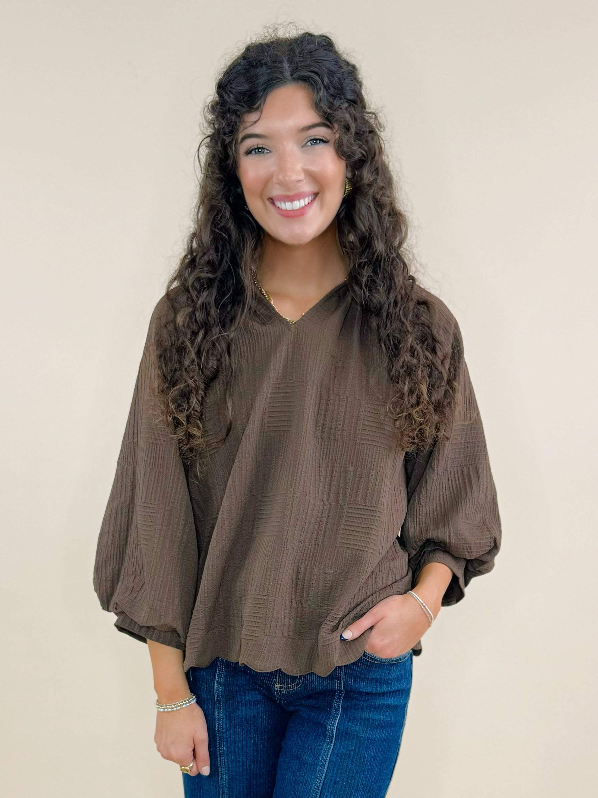 Brown textured blouse with a collared V-neckline, wide 3/4 batwing sleeves, and a scalloped hem. Designed with a flowy, relaxed silhouette for easy elegance.