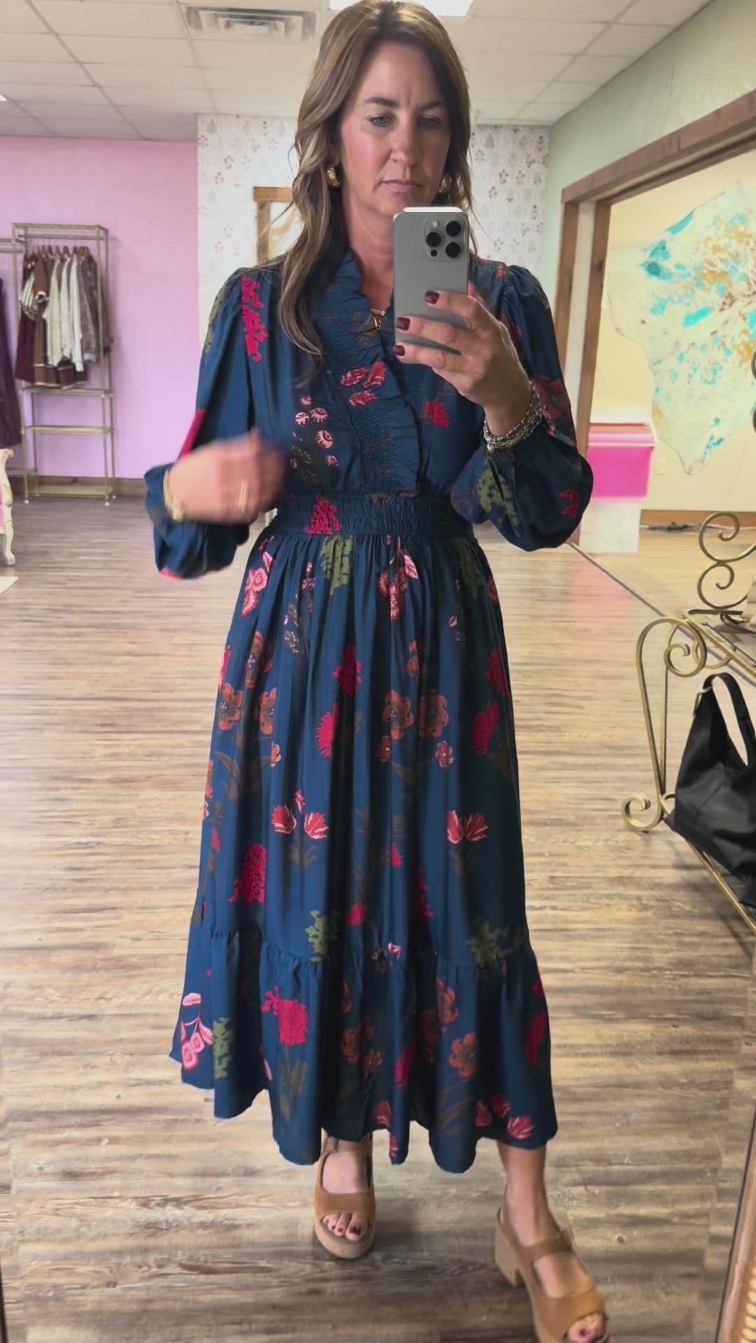 A midnight mix floral print maxi dress featuring a ruffle-trimmed V-neckline, long puff sleeves with elastic cuffs, and a smocked elastic waist for a flattering fit. Finished with a tiered skirt and lined for comfort.