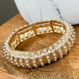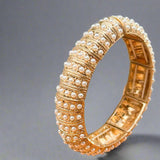 Elevate your look with the timeless charm of the Classic Pearl Elegance Bracelet. Featuring rows of delicate faux pearls set against a rich gold-tone backdrop, this bracelet is designed to add sophistication to any outfit. The intricate detailing and luxurious feel make it perfect for formal occasions, yet versatile enough to complement everyday style. A must-have accessory for a classic and polished look.